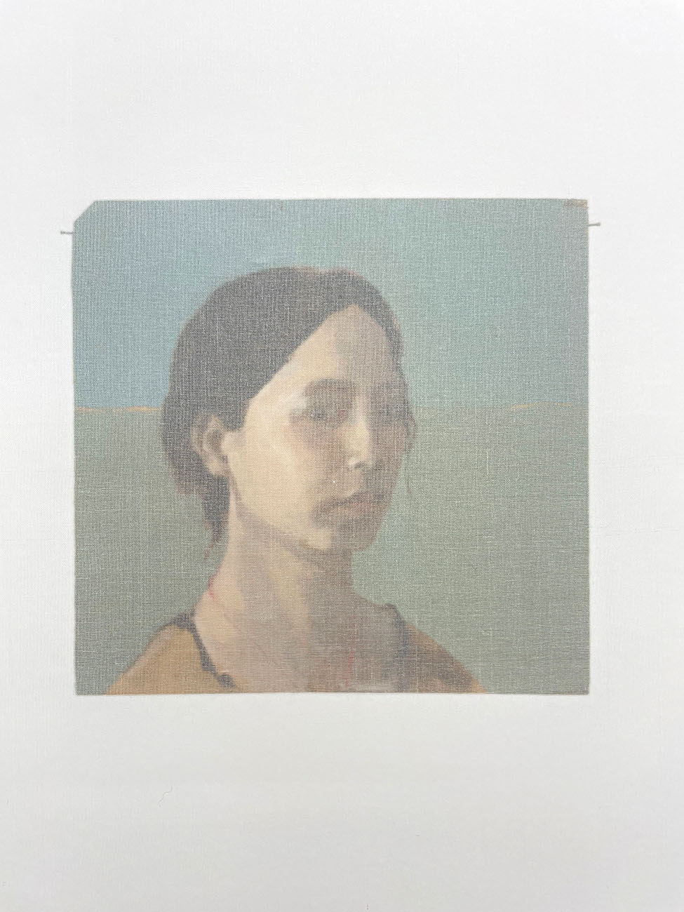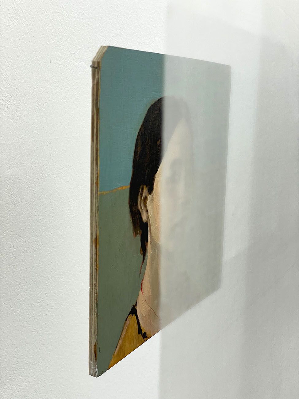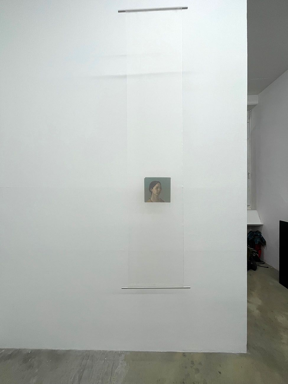 SELF PORTRAIT, exhibition view, lacquer and oil on panel, silk, aluminium, 2 parts, 20 x 20,5 cm panel , 260 x 40 cm silk, 2022