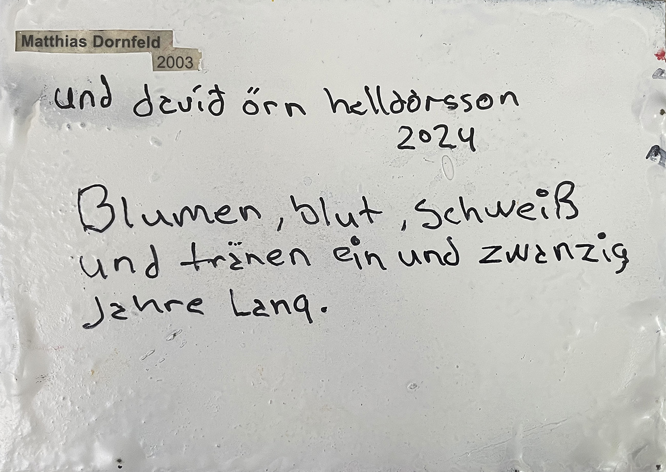 BLUMEN, BLUT, SCHWEIß UND TRÄNEN EINUNDZWANZIG JAHRE LANG, back side, mixed media on postcard, overpaitnted invitationcard from Matthias Dornfeld, 10,5 x 14,7 cm, 2024 -