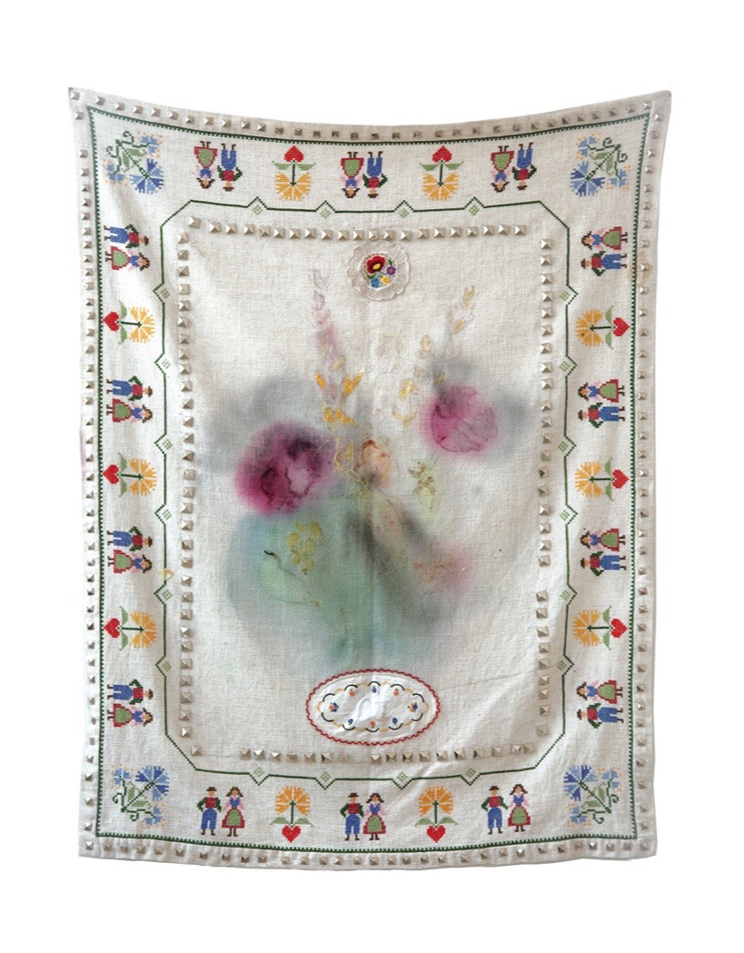 untitled (flower), Tischdecke, pigment, paint, stitching, studs, 140 x 100 cm, 2015