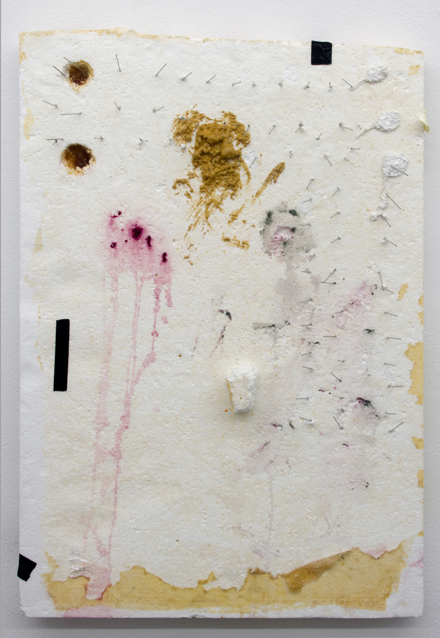 MY ITCHING PATE, EPS, Spray foam, latex, gouache, black tape, pigeon spikes, artifical maggot, 80 x 60 cm, 2013-2018